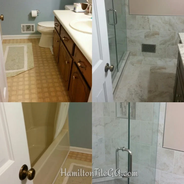 Back again with another tile update from Hamilton Tile! This bathroom for the Mayhew's in Marietta, GA was a tile emergency. Their previous shower was built so incorrectly it leaked to the point of rotting out their house. The old shower was your basic, builder grade, minimum standard, blowout special that we see so often: